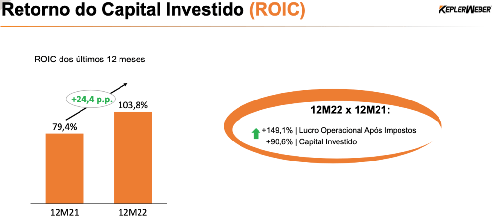 O EBITDA do ano foi de R$ 548,3 milhões, um aumento de 135,1% se comparado a 2021. O ROIC (retorno sobre capital investido) de 2022 aumentou 24,4% pontos percentuais em relação ao mesmo período do ano anterior, atingindo 103,8%.